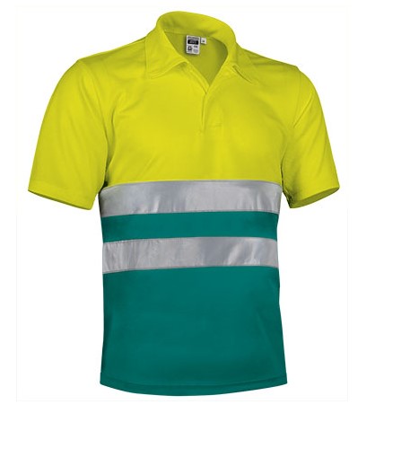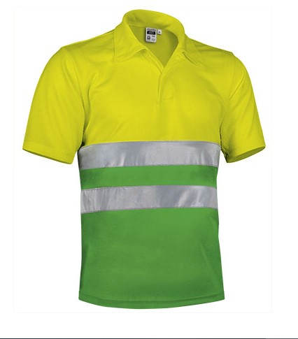Polo de manga curta amarelo fluo e verde com faixas refletoras horizontais