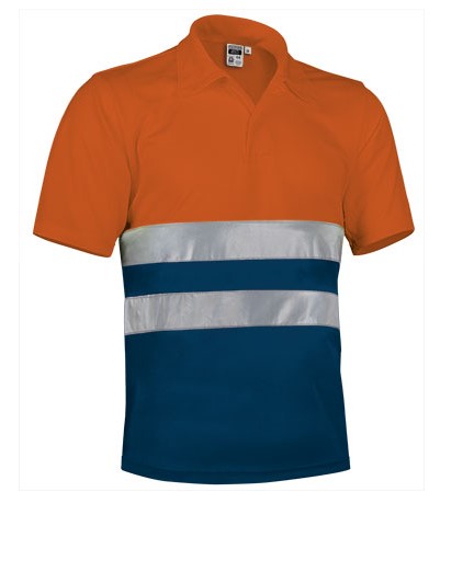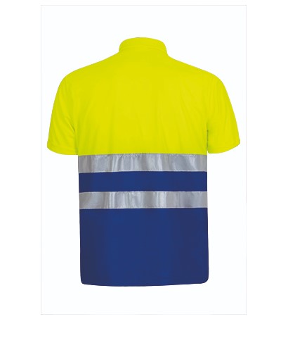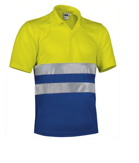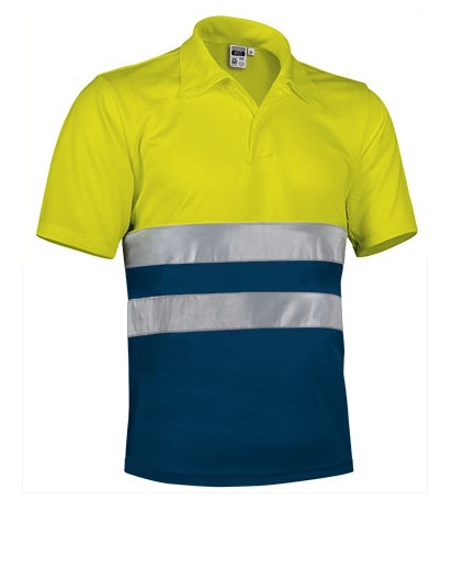 Polo de trabalho amarelo fluorescente com faixas refletoras cinza e azul