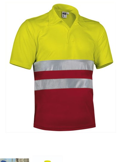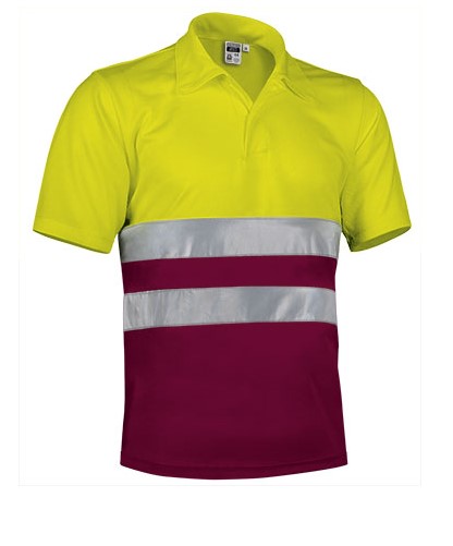 Camisola polo amarela fluorescente com faixas refletoras cinza e faixa vermelha
