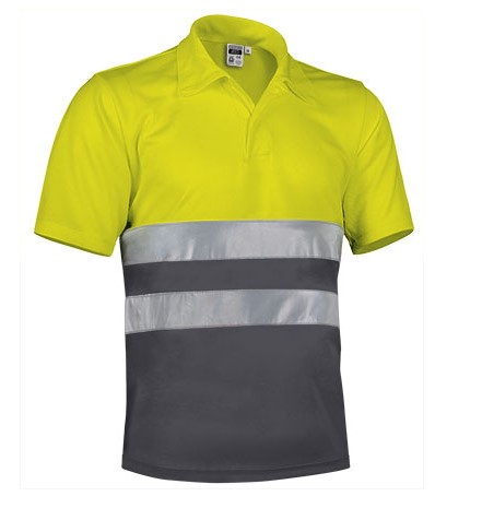 Polo bicolor amarelo fluorescente e cinza com faixas refletoras.