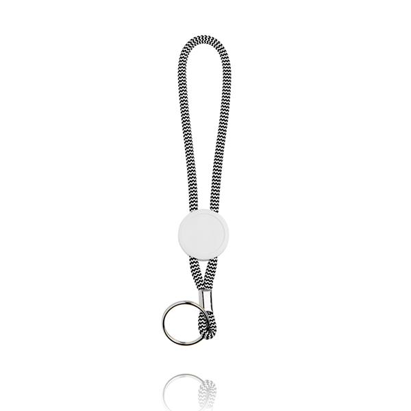 • Cordão preto e branco com anel metálico e disco branco no meio