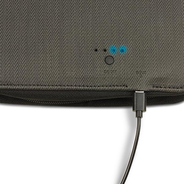 Bolsa cinza com padrão chevron, botão e LEDs azuis, cabo USB ligado.