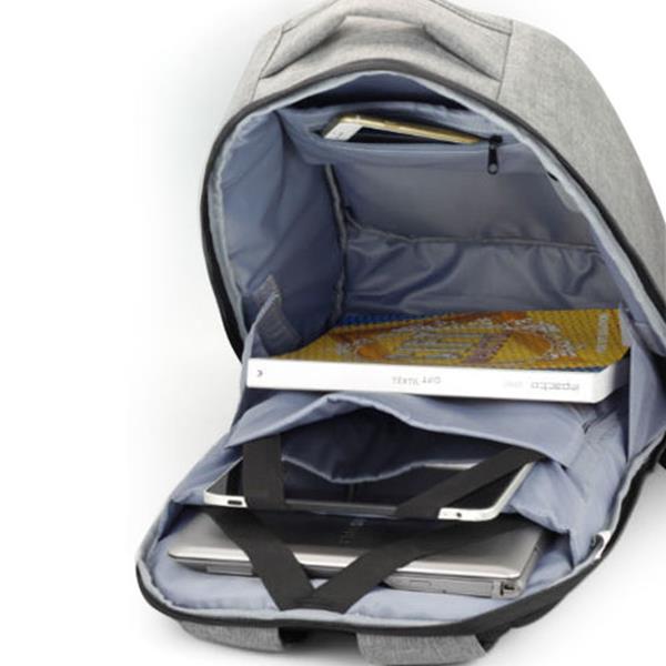 • Mochila cinza clara aberta mostrando compartimentos internos com laptop, tablet e livro