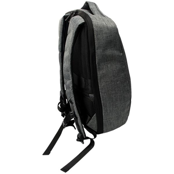 • Mochila cinzenta e preta com bolso lateral e smartphone colocado