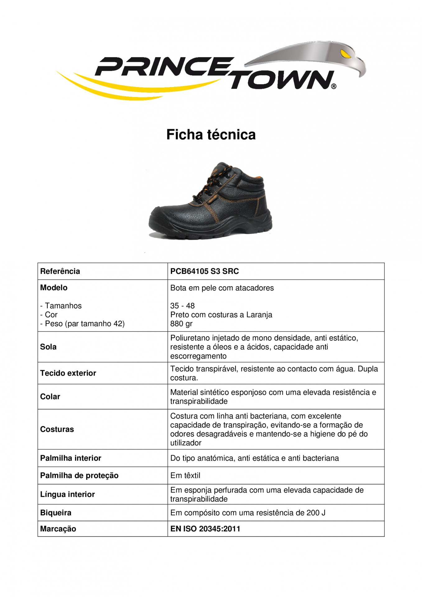 Ficha técnica bota de trabalho preta Prince Town com descrição técnica e tabela