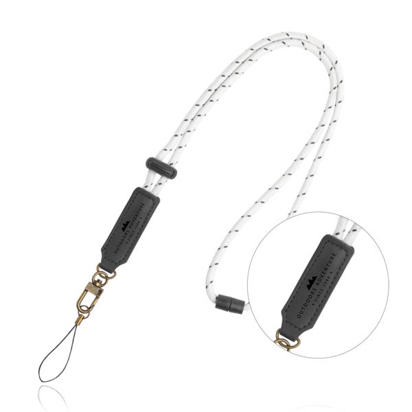 Lanyard premium em poliéster, com ajustável e fecho de segurança e mosquetão. Ideal para associar a um evento topo. Com detalhe em PU, mosquetão especial e acessório telemóvel.