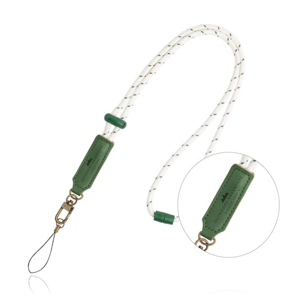 • Cordão para telemóvel branco com linhas verdes e suportes verdes em couro