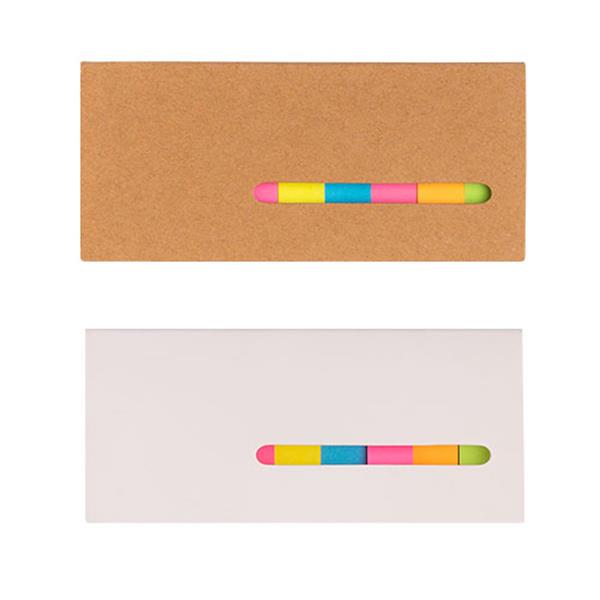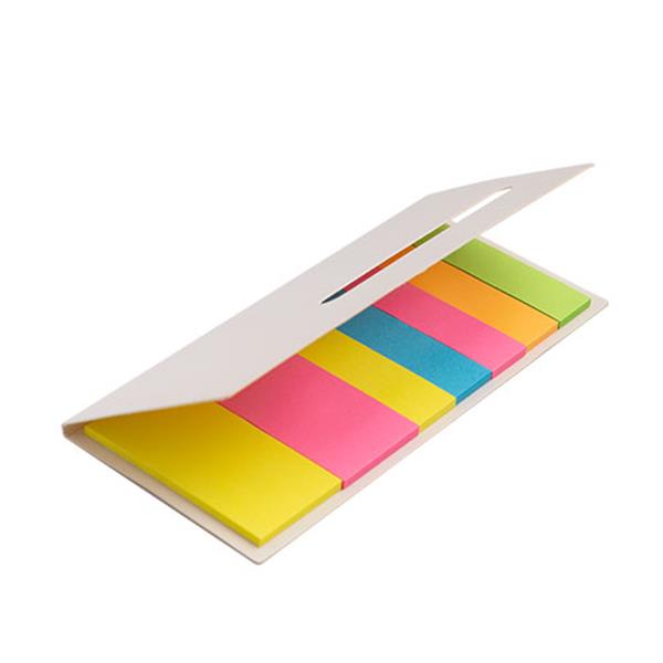 Bloco de notas adesivas. Este conjunto de notas adesivas incluí notas adesivas amarelas e rosas (20un/cor) e mini notas adesivas em amarelo, azul, rosa, laranja e verde (20un./cor). A capa contém uma janela que permite ver as cores do interior, dando um ar diferente à capa branca.