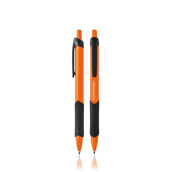 Caneta esferográfica laranja com detalhes pretos