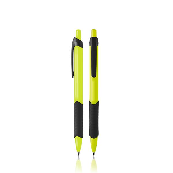 Duas esferográficas amarelo-neon e preto com detalhes em borracha.
