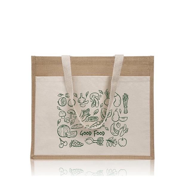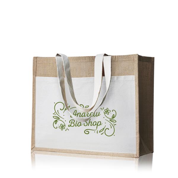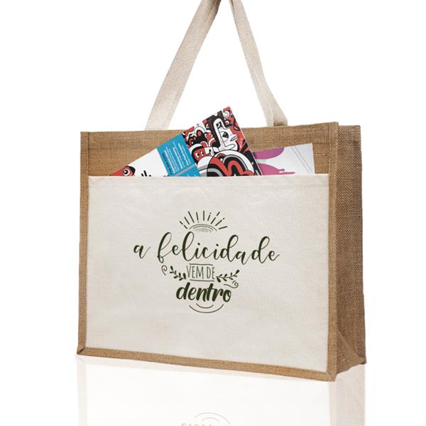 Saco Juta laminado com bolsa frontal em 100 % algodão, para que tenha acesso rapidamente aos acessórios mais utilizados durantes as suas compras, na praia, piscina...