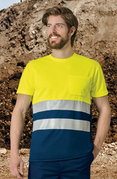 T-shirt bicolor de Alta Visibilidade, certificada como EPI de Categoria II segundo as normas EN ISO 13688 e EN ISO 20471, classe 1.