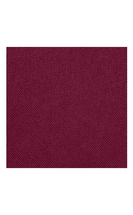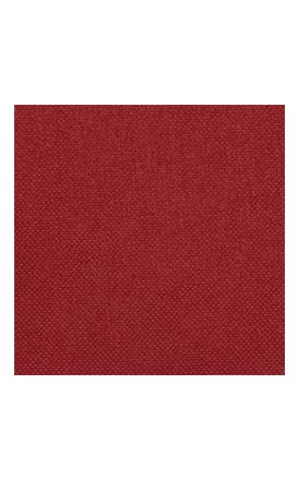 Mesa ajustada com toalha vermelha, pratos e guardanapos brancos, talheres pretos e copos de vinho