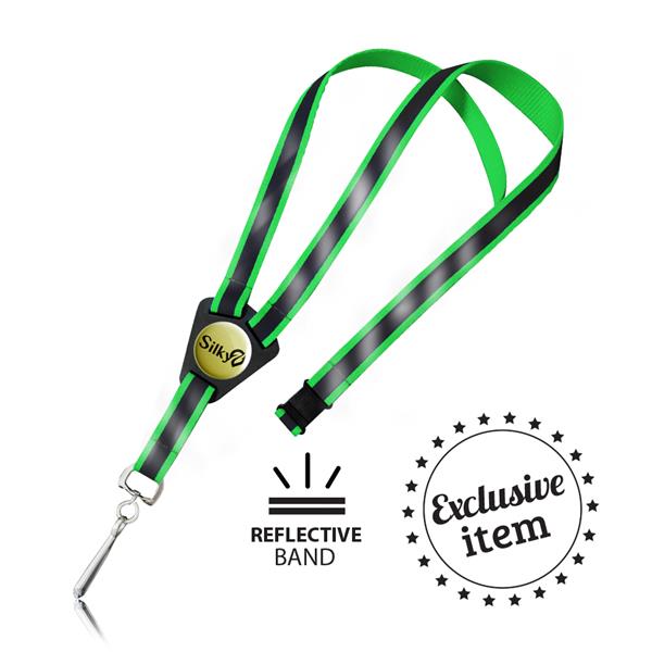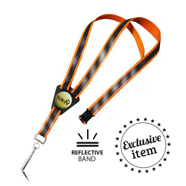 Lanyard com acessório em plástico e mosquetão em metal. Cores atrativas e faixa refletora. Esta lanyard conta com um acessório plástico, triangular, com um encaixe para resina. O mosquetão metálico permite prender credenciais ou chaves (etc…) com segurança,