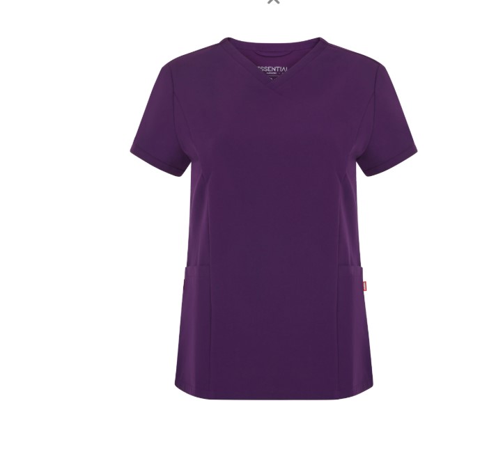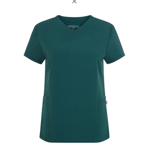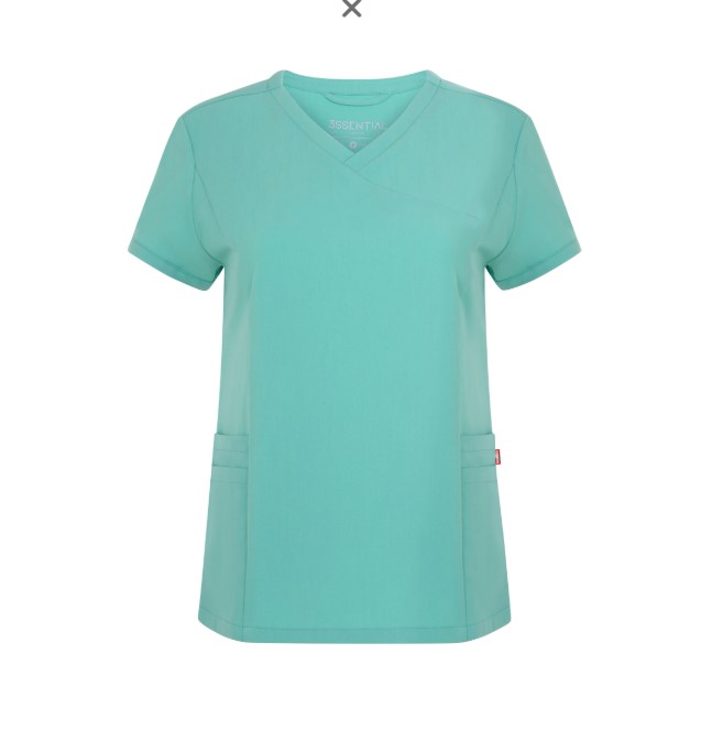 • Camisola médica verde água de manga curta com gola em V cruzada e bolsos frontais