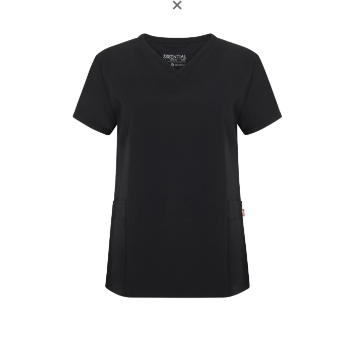 • Blusa preta com decote em V e bolsos frontais