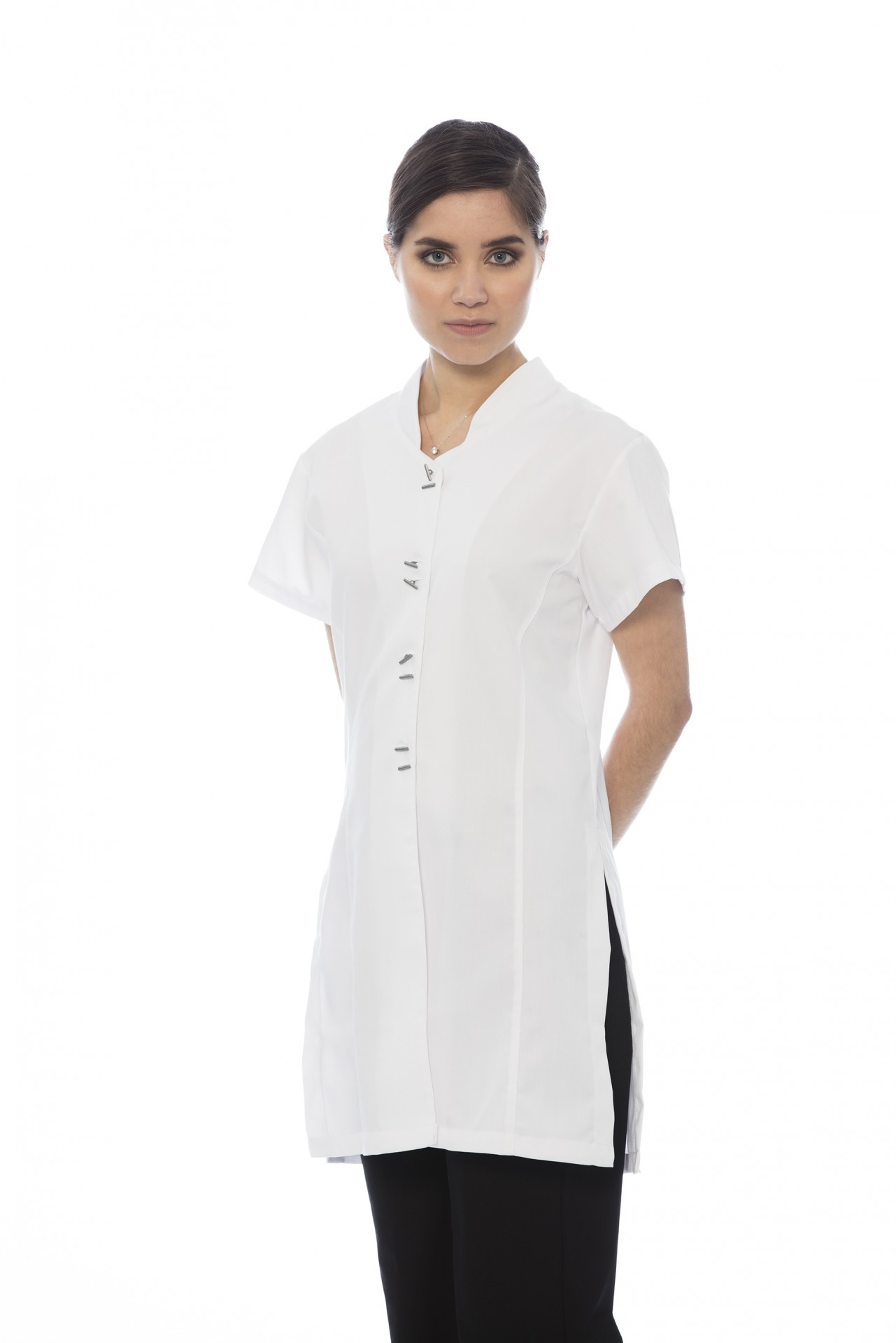 Túnica branca com mangas curtas e fecho de botões metálicos